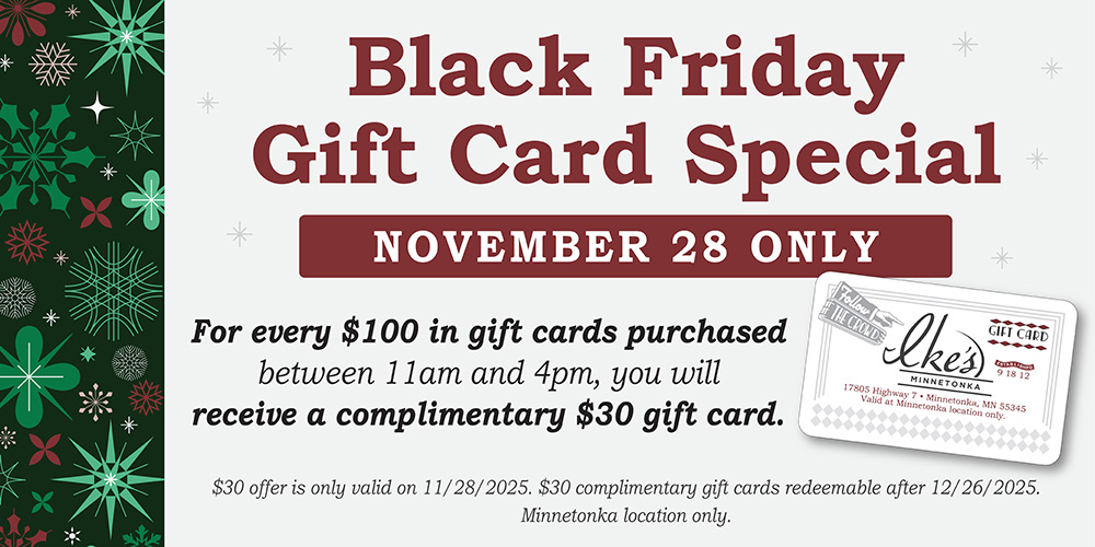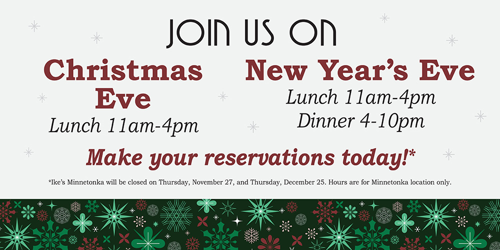 Nestled in the heart of the West Metro, Ike’s Minnetonka delivers an authentic urban experience in a light and family-friendly atmosphere. The result is a truly unique bar and dining establishment that the surrounding communities just can’t get enough of. From the minute you walk through the doors, you feel you have found the local watering hole as well as the best restaurant in town. The friendly staff, wine selection and wide variety of menu items makes it the ideal spot for everything from family dinner after the game to a memorable night of dinner and drinks with that favorite couple that you just don’t see often enough.